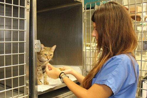 El veterinario también debe evaluar si el gato está receptivo al contacto, le gusta ser acariciado o demuestra interés por jugar, asignando una puntuación distinta en función de sus reacciones. La escala mide además si, una vez fuera de la jaula, el gato se mueve espontáneamente o de forma tímida, si se niega a moverse y también si toma el alimento que se le ofrece. Finalmente, colocando al gato en decúbito lateral o esternal se mide su presión arterial y se observa su reacción al tocar suavemente el abdomen y al presionarlo. Este mismo contacto se realiza sobre la herida quirúrgica para evaluar la reacción ante este estímulo.