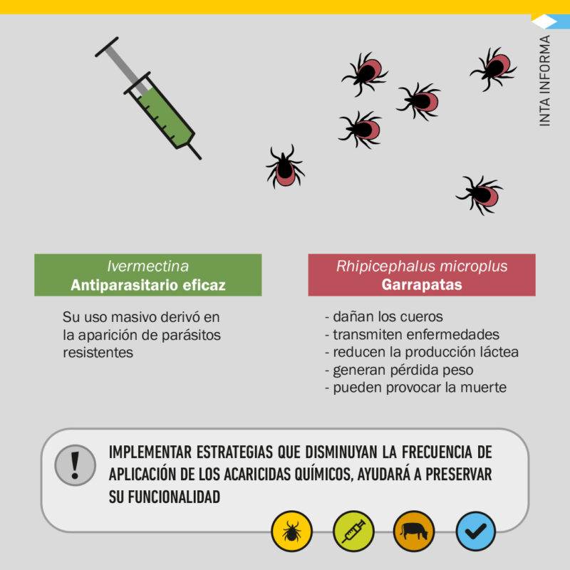 Investigadores del INTA, de la Universidad Nacional del Litoral y del Instituto de Pesquisas Veterinárias Desidério Finamor –Brasil– confirmaron diferentes niveles de resistencia a este antiparasitario en establecimientos ganaderos de la Argentina. Advierten sobre la importancia del uso adecuado del producto para preservar su funcionalidad. Palabras clave: Ivermectina. Garrapata bovina. INTA. Universidad Nacional del Litoral. Instituto de Pesquisas Veterinárias Desidério Finamor