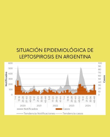 Entre los años 2020 y 2024, se notificaron en el Sistema Nacional de Vigilancia de la Salud (SNVS2.0) 10.983 casos con sospecha de leptospirosis, de los cuales 869 fueron clasifica-dos como casos para este evento. El año con la mayor cantidad de casos registrados fue 2024, mientras que la región Centro se destacó por concentrar el mayor número de casos a lo largo de todo el período. TAGS: Leptospirosis. Epidemiología. Salud pública. Salud