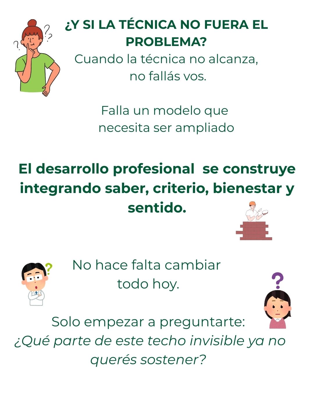 En MentoríaVet360 se integran y articulan esas seis dimensiones entendiendo que el crecimiento profesional no es lineal ni exclusivamente técnico, sino un proceso que se construye a medida de cada un@ e impacta tanto en la calidad del servicio que prestamos como en la salud de quienes lo brindan.