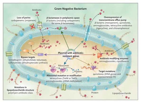 Esta imagen, publicada en el último número de New England Journal of Medicine, ilustra los diferentes mecanismos que poseen las bacterias para resistir a los antibióticos. En ella se esquematizan los 8 mecanismos conocidos hasta la fecha para resistir los antibióticos. Como resumen general los sistemas de resistencia se basan en evitar que el antibiótico acceda a su diana y lo dañe, y en la evolución han aparecido diversos mecanismos para que eso ocurra.
