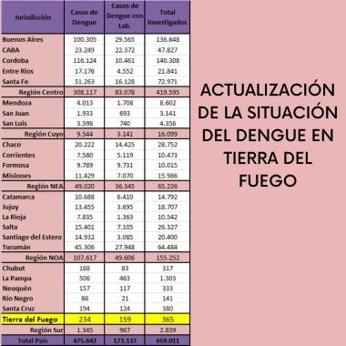 El presente escrito consolida información recolectada sobre la situación de Dengue en el País y en la provincia de Tierra del Fuego. Para su confección se recopiló información de fuentes oficiales secundaria, nombradas oportunamente en cada apartado. TAGS: Dengue. Tierra del Fuego. Salud pública. Una Salud. One Health