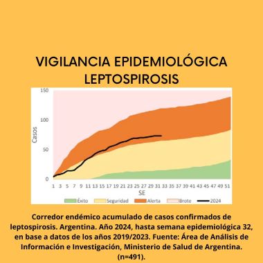 Entre la semana epidemiológica (SE) 1 de 2019 y la SE 32 de 2024, se notificaron en el Sistema Nacional de Vigilancia de la Salud (SNVS2.0) 13.406 casos de leptospirosis, de los cuales 491 fueron confirmados, 655 probables, 4.613 descartados y los 7.647 restantes fueron clasificados como sospechosos. En cuanto a los casos confirmados, 91,5% registra al menos una prueba de laboratorio confirmatoria. TAGS: Leptospirosis. Epidemiología. Salud pública. Una Salud. One Health.