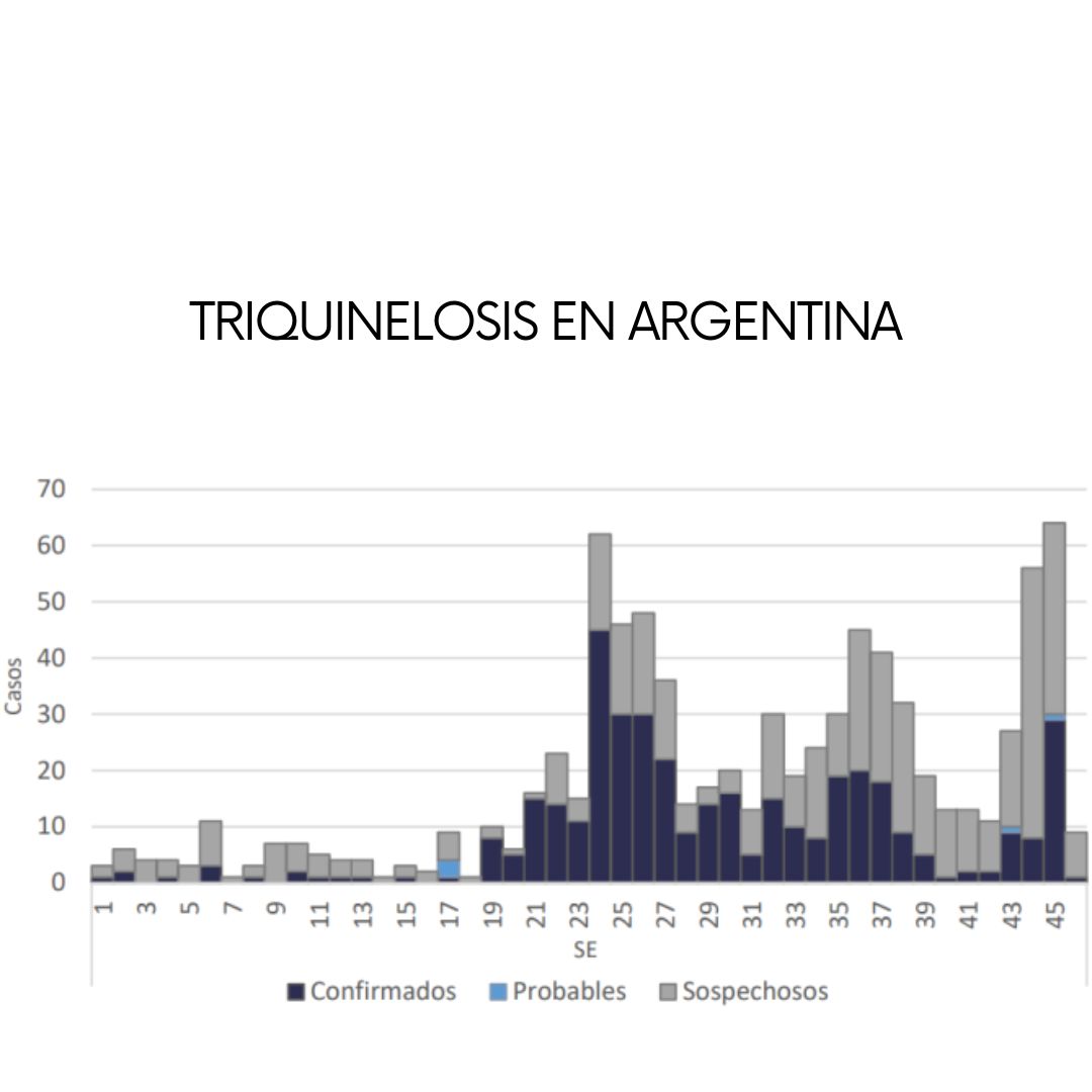 En 2024, hasta la semana epidemiológica (SE) 46, se registraron en el Sistema Nacional de Vigilancia de la Salud (SNVS2.0) 853 casos sospechosos, de los cuales 395 fueron confirmados, cinco son probables, 16 fueron descartados y los 437 restantes permanecen como sospechosos, muchos de ellos asociados a brotes en curso en investigación. TAGS: Triquinelosis. Epidemiología. Salud pública. Zoonosis. Sanidad animal. Una Salud. One Health