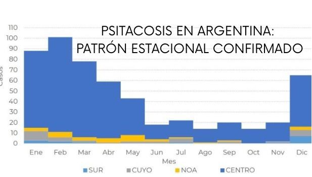 Entre la semana epidemiológica (SE) 27 de 2025 y la SE 3 de 2026 se notificaron 292 casos sospechosos de psitacosis en Argentina, con 14 casos confirmados y 9 probables según el Sistema Nacional de Vigilancia de la Salud (SNVS 2.0). El análisis histórico (2018–2026) muestra un patrón estacional: los casos aumentan en las últimas y primeras semanas epidemiológicas de cada año, coincidiendo con los meses de mayor temperatura. Esto refuerza la importancia de la vigilancia epidemiológica y la prevención en períodos de calor. TAGS: Psitacosis. Zoonosis. Salud pública. Vigilancia epidemiológica. Epidemiología. Una Salud. One Health