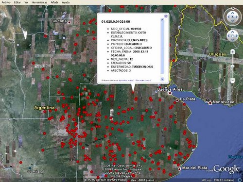 Establecimiento (elegido al azar). Al hacer “click” sobre el mismo, se visualizan todos sus datos: frigorífico al que envía sus animales (en este caso Coto), ubicación, oficina local responsable, fecha de faena, total de afectados en faena para tuberculosis. (Ver imagen 5)