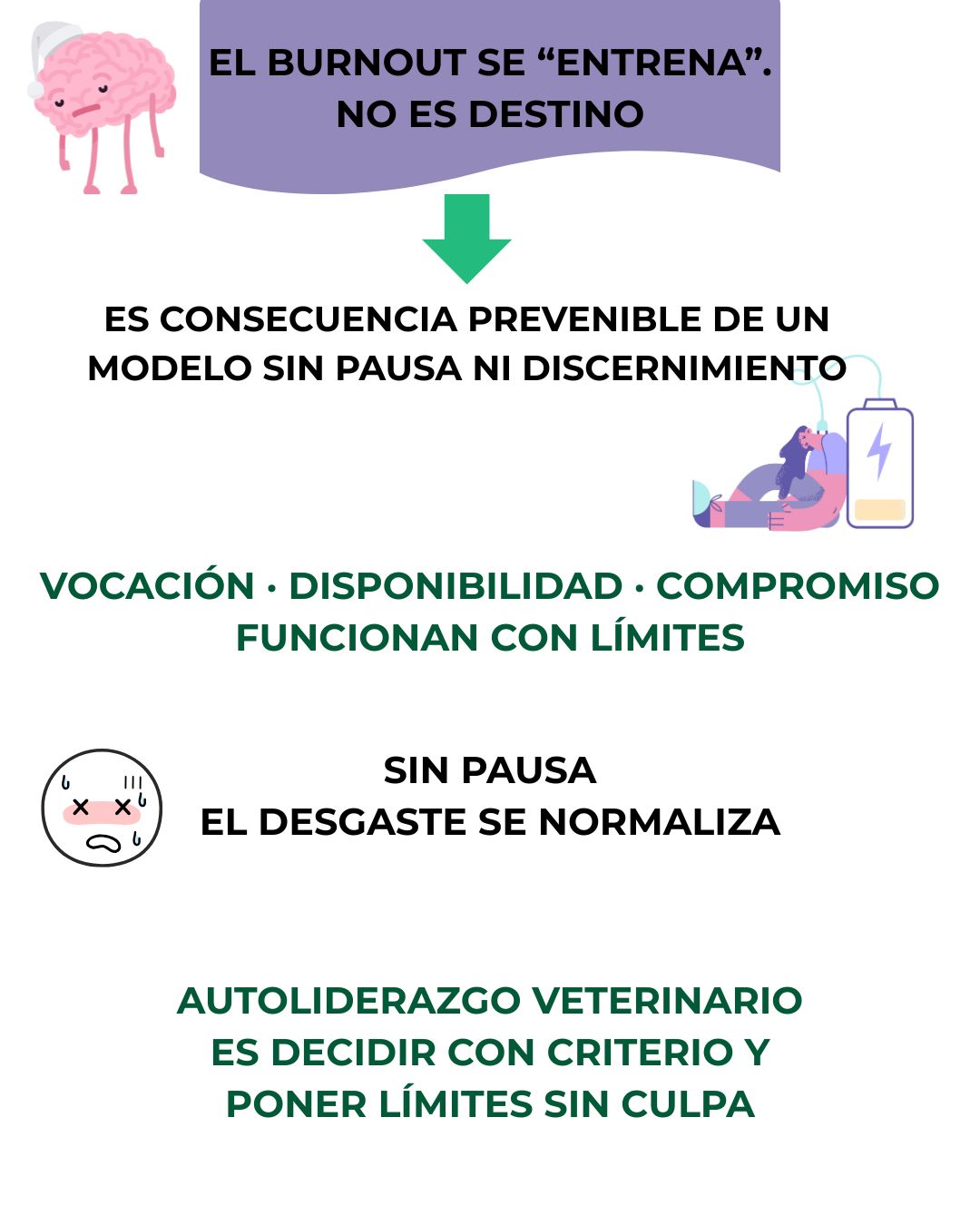 Al inicio de nuestro trayecto profesional contamos con esa energía arrolladora y necesaria para afrontar la nueva etapa. No hay descanso, no existe un “no puedo”. Lo que no tenemos en cuenta es que en la actualidad ser veterinari@ no es únicamente estar disponible de manera presencial. Los límites entre la vida profesional y la personal están desdibujados.