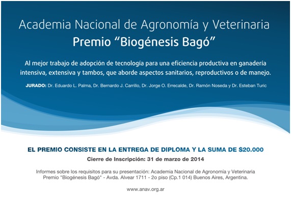 La Academia Nacional de Agronomía y Veterinaria, en adelante “ANAV” y el laboratorio Biogénesis Bagó SA, en adelante “Biogénesis Bagó”, buscan reconocer y premiar ejemplos de esfuerzos profesionales, premiando al mejor trabajo de adopción de tecnología para una mayor eficiencia productiva en ganadería intensiva, extensiva y tambos que aborde aspectos sanitarios, reproductivos o de manejo con impacto en la producción bovina realizado en el país.