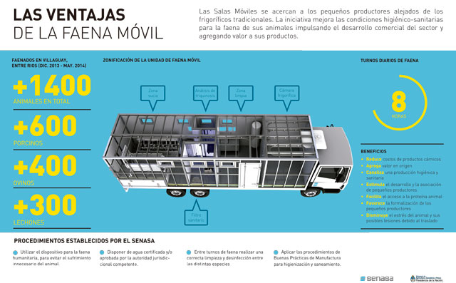 Entre diciembre de 2013 y mayo de 2014 la Sala de faena móvil instalada en Villaguay, Entre Ríos, faenó más de 1400 animales entre porcinos, ovinos y lechones. Por su parte, las gobernaciones de Chaco, Formosa, Catamarca y La Rioja ya solicitaron la provisión de una sala de este tipo a través de convenios firmados en el marco del Programa de Desarrollo de Economías Regionales.