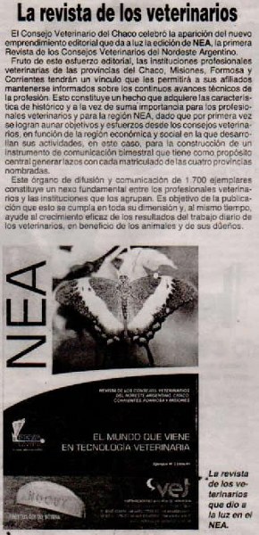 La revista de los Consejos Veterinarios del NEA, con 1.700 ejemplares, constituye un instrumento de comunicación que tiene como propósito central generar lazos entre los matriculados de las cuatro provincias del noreste argentino. Asimismo, constituye un nexo fundamental entre los profesionales y las instituciones que los representan, como así también con empresas del sector.
