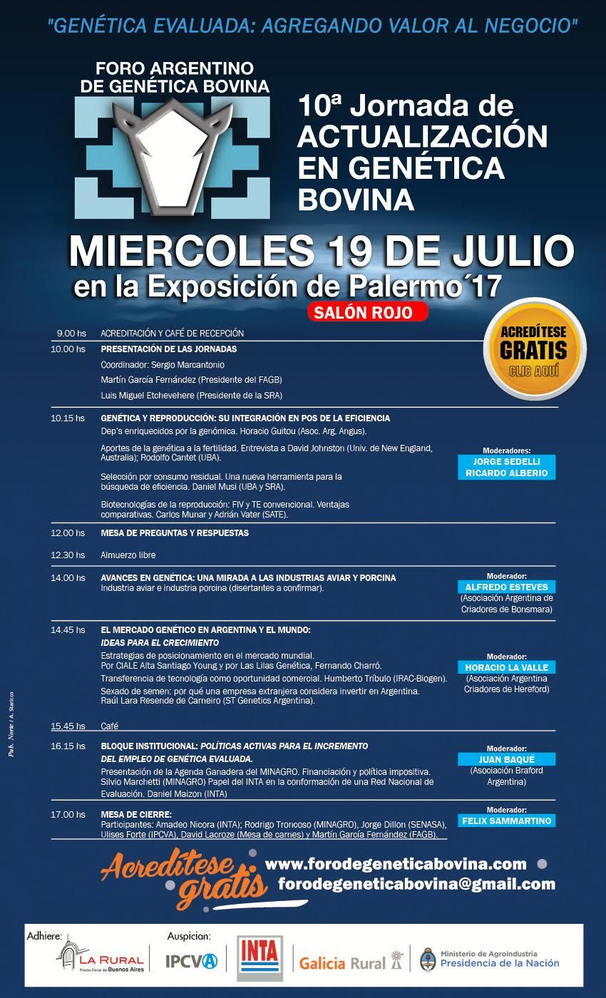“Genética evaluada: agregando valor al negocio”. El Foro Argentino de Genética Bovina (FAGB) realizará el miércoles 19 de julio la 10a Jornada de Actualización, una vez más en el marco de la Semana de la Carne, durante la Exposición Rural de Palermo.