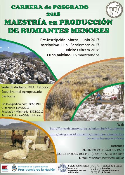La Estación Experimental Agropecuaria Bariloche del INTA junto a las Facultades de Ciencias Agrarias de la Universidad Nacional del Comahue y la Universidad Nacional de Rosario informan que se encuentra abierta la inscripción al segundo ciclo de la Maestría en Producción de Rumiantes Menores, cuyo dictado dará comienzo el año próximo. Dicho período de inscripción finaliza el 30 de septiembre de 2017.