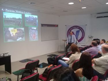 En una jornada muy enriquecedora transcurrió el Curso de actualización y capacitación de Posgrado sobre Medicina Veterinaria Legal. El docente, Médico Veterinario, Comisario General Jorge Paez Barrios, abordó temas tales como: La importancia de la Medicina Veterinaria Forense o Legal, ámbito de actuación del Médico Veterinario, la Peritación Médico Legal, la importancia pericial, características especiales de bovinos y equinos; pasando por temáticas referidas al examen de la marca, la señal, pericial de cueros y carnes clandestinas.