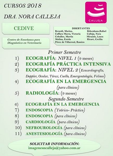 Se encuentra disponible el listado de Cursos para el año 2018 organizados por el Centro de Enseñanza para Diagnóstico en Veterinaria (CEDIVE) de la Dra. Nora Calleja.