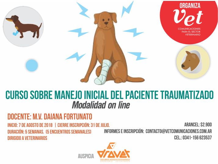 Cierre inscripción: 31 de julio. El 7 de agosto de 2018 inicia el Curso Online teórico práctico sobre manejo inicial del paciente traumatizado a cargo de la MV Daiana Fortunato, organizado por Vet Comunicaciones y auspiciado por Drovet, insumos agropecuarios.