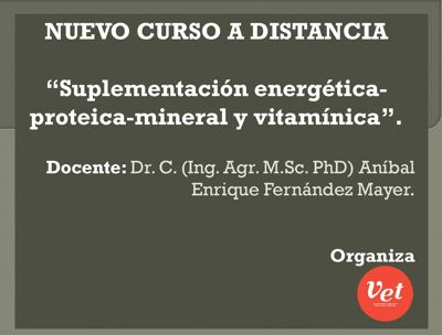 Vet Comunicaciones lanza un nuevo Curso a Distancia. En este caso se abordarán temas referidos a Suplementación energética, proteica, mineral y vitamínica en rumiantes. Docente a cargo del Dr. C. (Ing. Agr. M.Sc. PhD) Aníbal Enrique Fernández Mayer. Auspicia Drovet, insumos agropecuarios.