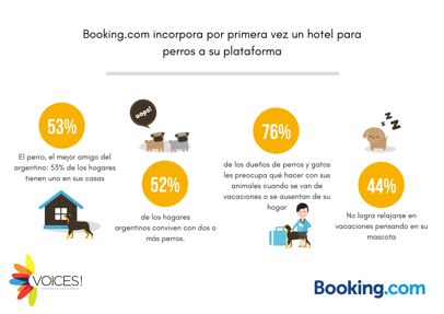 Booking.com y Voices! realizaron un estudio a nivel nacional para investigar la importancia de las mascotas en los hogares argentinos y conocer las preocupaciones que aparecen a la hora de planificar un viaje. El 44% de los dueños de perros y gatos manifiesta que no logra relajarse en las vacaciones pensando en sus mascotas. El perro es el mejor amigo del argentino: 53% de los hogares tienen uno en sus casas.