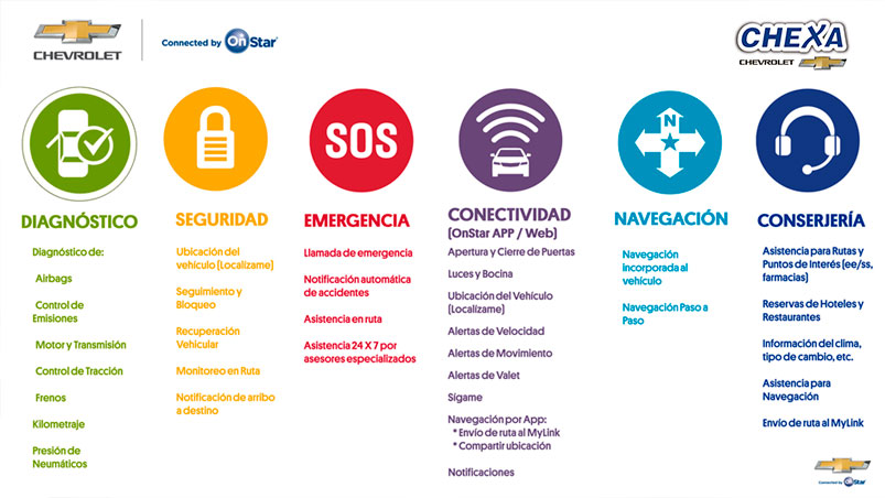 EMERGENCIAS: los imprevistos y emergencias pueden ocurrir en cualquier momento y lugar, un neumático se puede pinchar, una persona se puede sentir mal o podes tener un accidente o choque, en todos estos casos basta con tocar el botón rojo SOS para accionar la atención de emergencia. En casos más graves, por ejemplo cuando se accionen los airbags, OnStar entrara en contacto directamente con tu vehículo, incluso en casos que no puedas atender se encargará de enviar la ayuda necesaria.