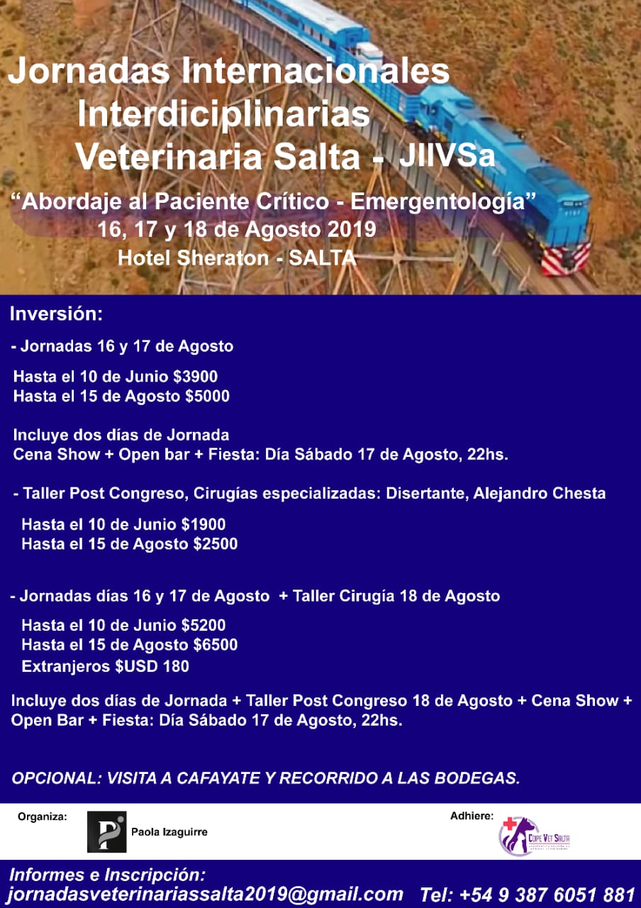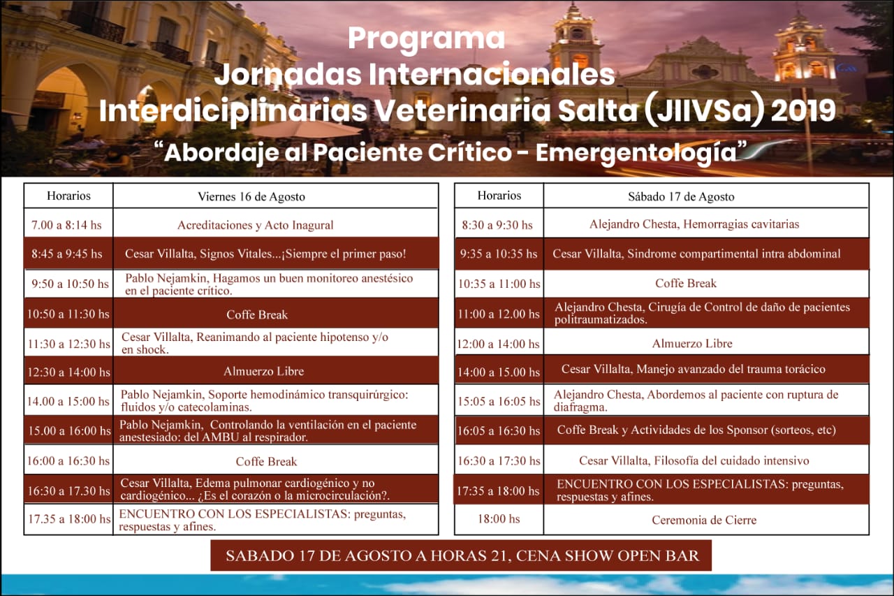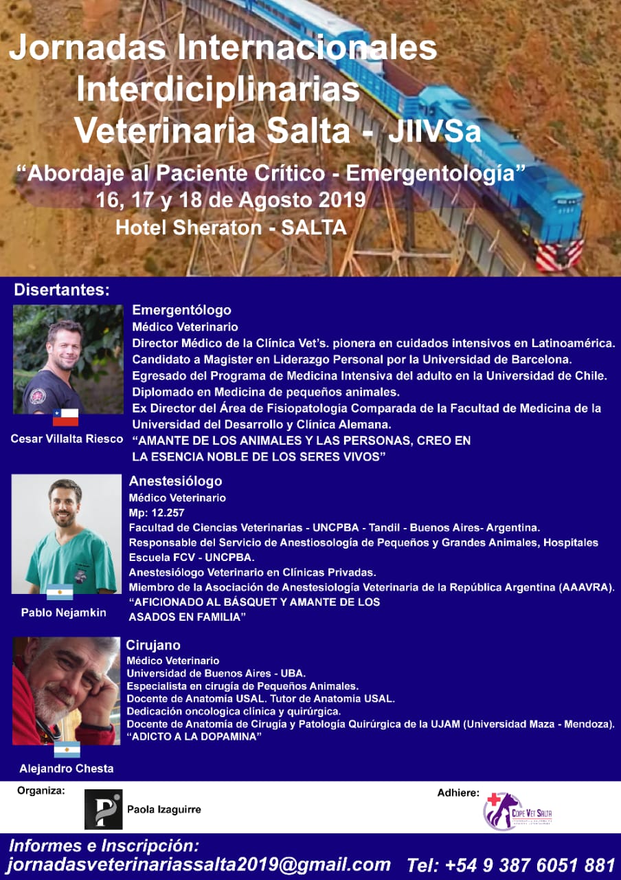 Tres días cargados de Disertantes y Capacitación del primer nivel: Jornadas Internacionales Interdisciplinarias Veterinarias, en el Hotel Sheraton, Salta, Argentina. La temática será: “ABORDAJE AL PACIENTE CRÍTICO”. “EMERGENTOLOGIA”. 16, 17 y 18 de agosto de 2019.