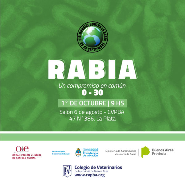 El Colegio de Veterinarios de la Provincia de Buenos Aires en conjunto con la Organización Mundial de Sanidad Animal, la Secretaria de Gobierno de Salud de Nación, el Ministerio de Agroindustria y el Ministerio de Salud de la Provincia de Buenos Aires llevarán a cabo el próximo martes 1 de octubre la Jornada “Rabia: un compromiso en común | 0 – 30”,en el marco del día Mundial de la Rabia a celebrarse el 28 de septiembre.