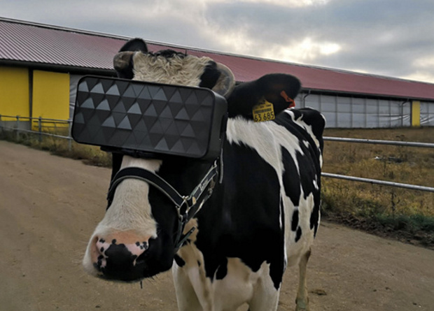 Los empleados de una granja de Moscú, Rusia y una compañía de TI anónima crearon y probaron un casco de realidad virtual para vacas. Según un comunicado del Ministerio de Agricultura de la Federación de Rusia, los experimentos con el casco demostraron que se puede reducir la ansiedad en las vacas.