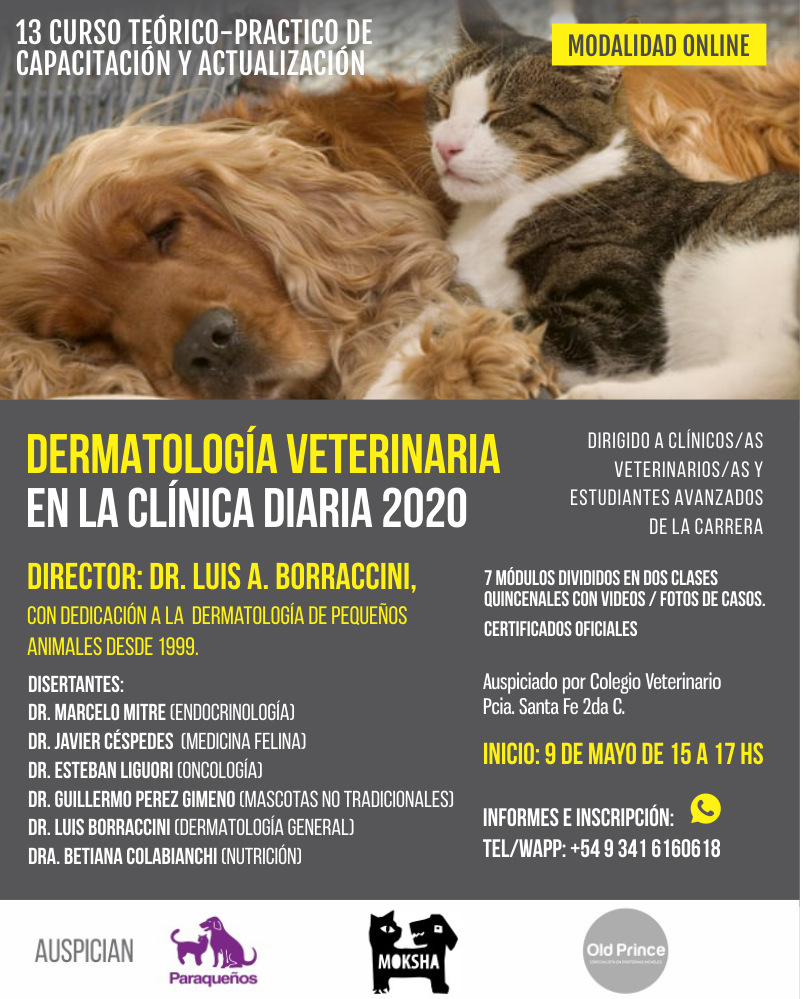 13 er Curso Teórico-Práctico de Capacitación y Actualización dirigido a Clínicos/as Veterinarios/as. 7 módulos. Inicio: 9 de mayo de 2020. MODALIDAD ONLINE. Palabras clave: Curso. Dermatología veterinaria. Médicos veterinarios