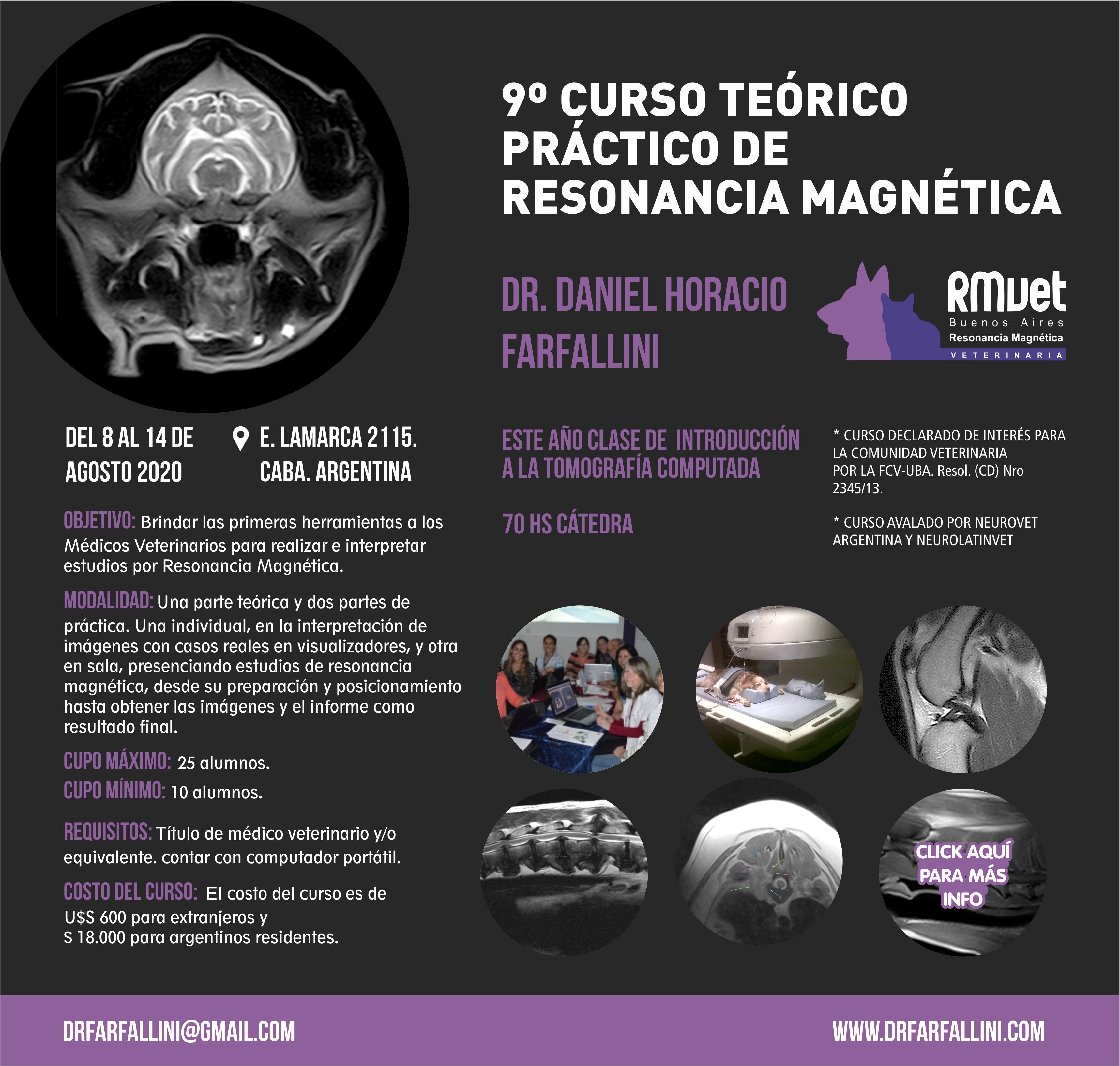 Del 8 al 14 de agosto de 2020 se llevará a cabo 9° Curso Teórico Práctico de Resonancia Magnética a cargo del Dr. Daniel H. Farfallini, con cupo limitado. Palabras clave: Curso. Resonancia magnética. Veterinarios.