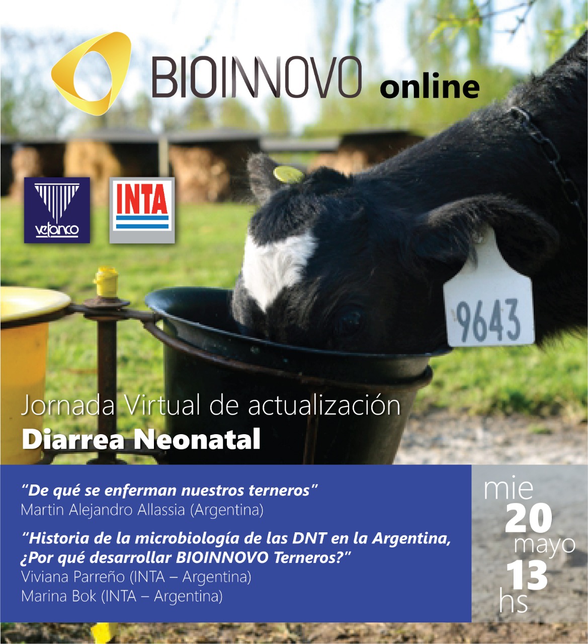 Vetanco SA e INTA organizan una Jornada Virtual de Bioinnovo, en la que brindarán una actualización sobre diarrea neonatal el próximo miércoles 20 de mayo a las 13.00 hs. Palabras clave: Jornada virtual. Diarrea neonatal. Veterinarios.