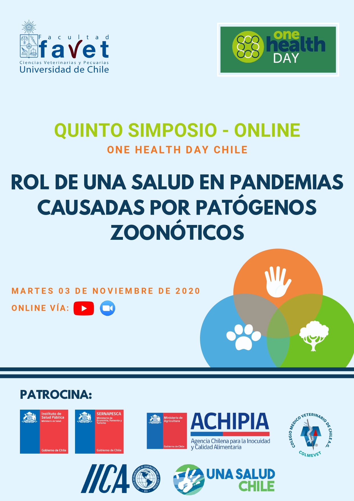 La sociedad se enfrenta a la pandemia de COVID-19 que desafía la salud, la ciencia y la economía a nivel mundial. Por este motivo, FAVET organiza su V Simposio One Health Day centrado en el papel de Una Salud en las pandemias provocadas por patógenos zoonóticos, desde el enfoque molecular hasta su impacto en la economía. Palabras clave: One Health. Zoonosis. FAVET. Simposio. Salud pública. Pandemia.