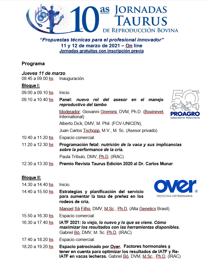 El 11 y 12 de marzo se realizarán en forma online las Décimas Jornadas Taurus de Reproducción Bovina “Propuestas técnicas para el profesional innovador”. Las mismas son gratuitas con inscripción previa. Palabras clave: Jornadas. Taurus. Reproducción bovina.