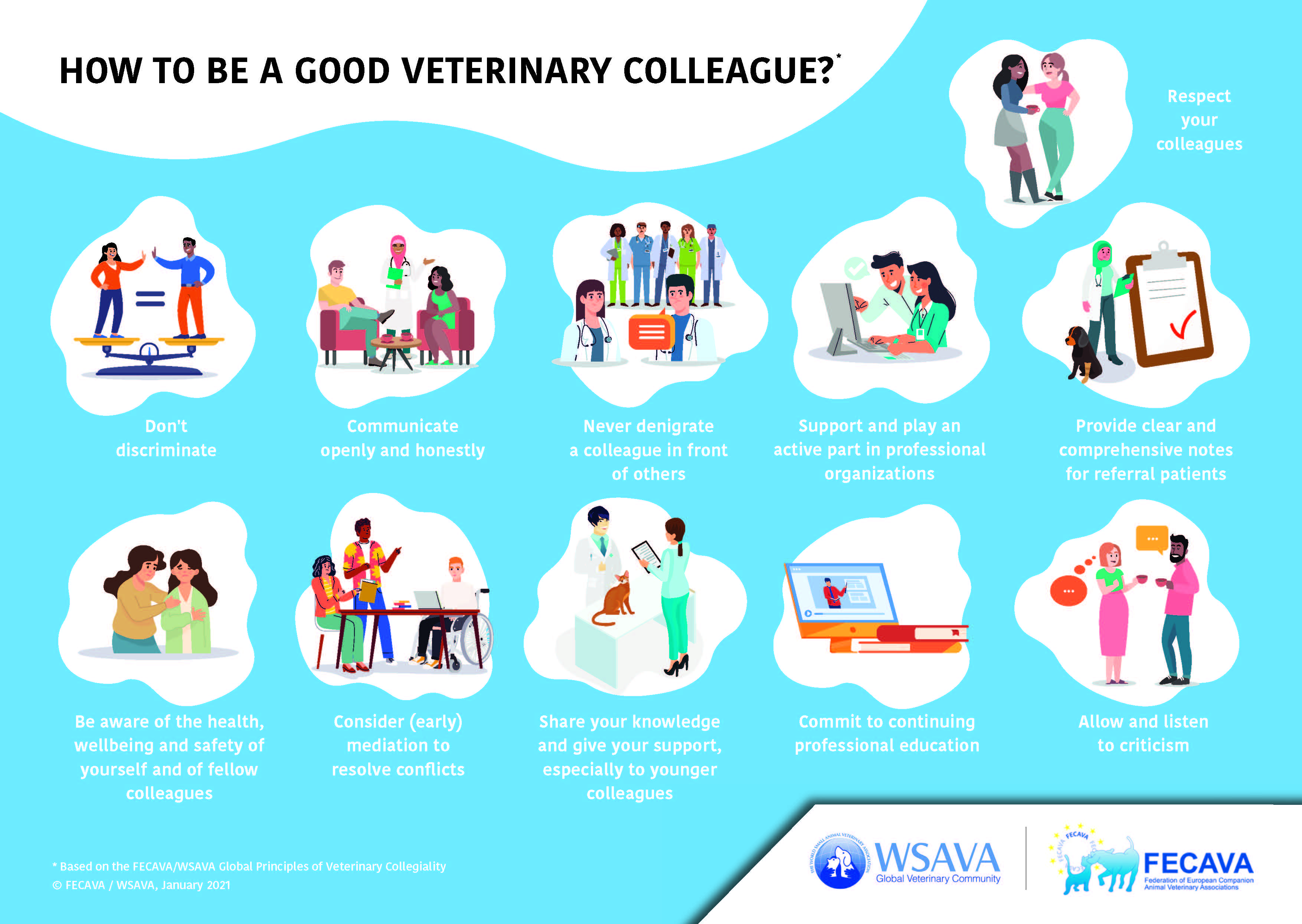 La Federación Europea de Asociaciones Veterinarias de Animales de Compañía (FECAVA) y la Asociación Mundial de Veterinarios de Pequeños Animales (WSAVA) han lanzado una infografía para prácticas veterinarias en todo el mundo para ayudarles a recordar sus 'Principios Globales de Colegialidad Veterinaria', lanzados a principios de este año. Palabras clave: FECAVA. WSAVA. Colegialidad Veterinaria.