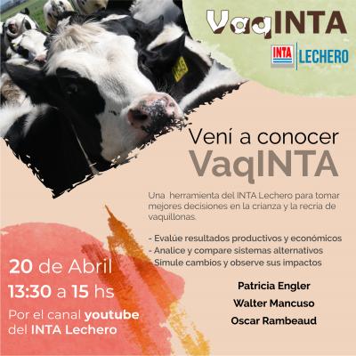 VaqINTA es una aplicación informática que facilita la sistematización y el procesamiento de toda la información necesaria para analizar y comparar sistemas de cría y recría de vaquillonas. Diseñada por especialistas del INTA, permite realizar registros completos, con análisis físicos y económicos y se adapta a las diferentes zonas ganaderas del país. Palabras clave: Tambo. Informática. INTA.