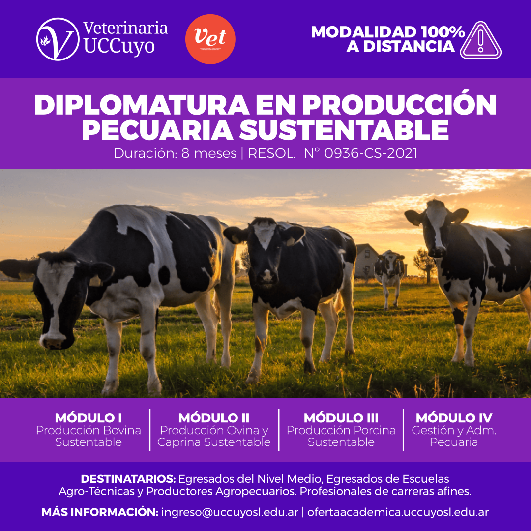 Está abierta la inscripción para la Diplomatura en Producción Pecuaria Sustentable organizada por la Facultad de Ciencias Veterinarias de la Universidad Católica de Cuyo, San Luis (UCCuyo), auspiciada por Vet Comunicaciones. Palabras clave: Diplomatura. Producción Pecuaria. Sustentabilidad. FCV-UCCuyo.