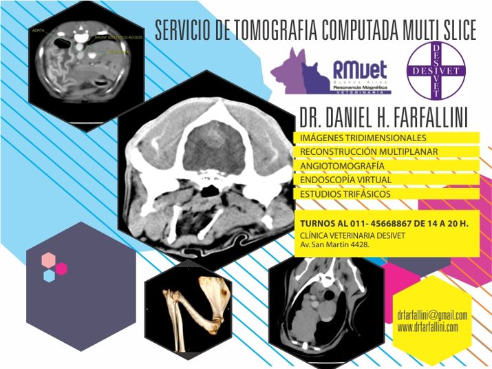 Clínica Veterinaria DESIVET cuenta con el servicio de Tomografía Computada Multislice a cargo del Dr. Daniel H. Farfallini. Palabras clave: Tomografía Computada Multislice. Veterinaria.