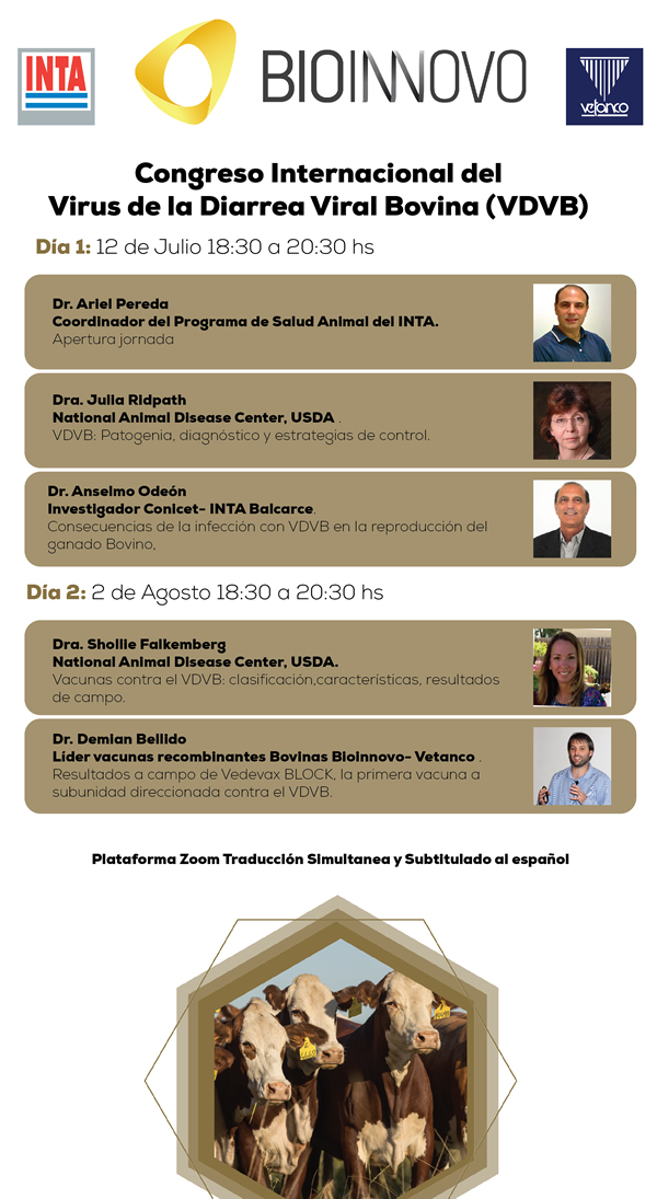 Bioinnovo, la empresa público-privada formada por Vetanco y el INTA, organiza el Primer Congreso Internacional del Virus de la Diarrea Viral Bovina, a realizarse de forma virtual en dos jornadas, los días lunes 12 de julio y 2 de agosto próximos. Los temas a desarrollar estarán vinculados al Virus de la Diarrea Viral Bovina: medidas de control, consecuencias de la infección, clasificación y características de vacunas disponibles y los resultados a campo de Vedevax BLOCK, la primera vacuna a subunidad direccionada contra el VDVB.
