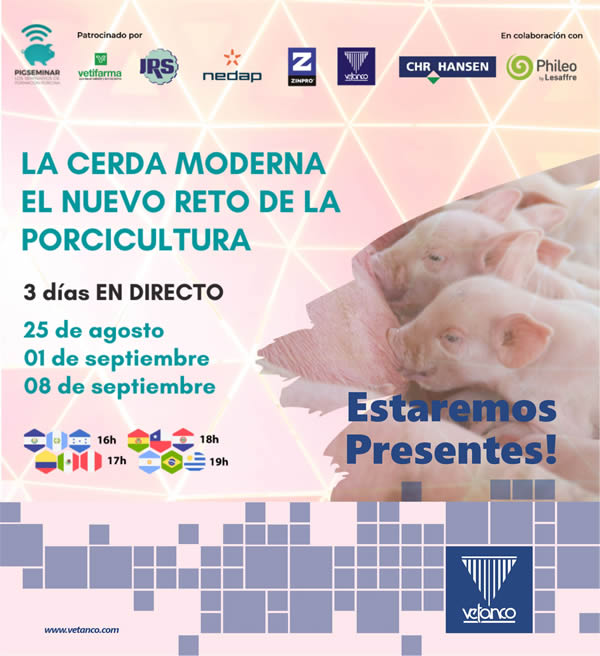 Los próximos 25 de agosto, 01 de septiembre y 08 de septiembre a las 19.00 hs. (horario Argentina), se llevará a cabo el PigSeminar "La cerda moderna, el nuevo reto de la porcicultura”, webinars de Porcinews Latam. En este marco, Vetanco, un laboratorio veterinario internacional que desde hace más de 30 años desarrolla, elabora y comercializa productos innovadores para la salud y la producción animal participa como patrocinante. En la última fecha, el 8 de septiembre, a las 19.30 hs., el MV Alberto Armocida, asesor técnico de su División de Cerdos, estará disertando sobre Salud Intestinal.