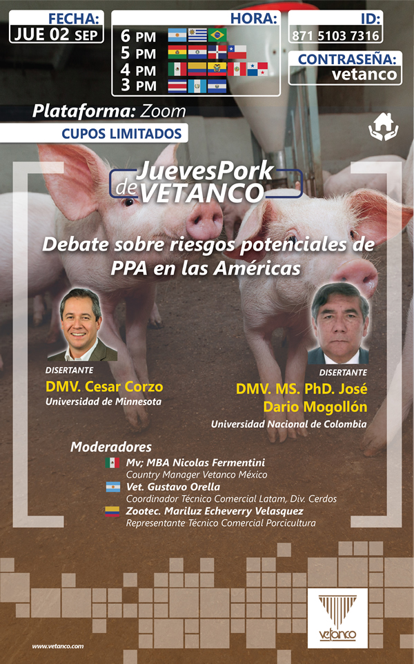 Vetanco, un laboratorio veterinario internacional que desde hace más de 30 años desarrolla, elabora y comercializa productos innovadores para la salud y la producción animal, organiza un nuevo Jueves Pork para LATAM con el título “Debate sobre riesgos potenciales de PPA en las Américas”, donde se abordará la problemática actual de la Peste Porcina Africana (PPA) en América. La cita es el próximo jueves 2 de septiembre a las 16 hs., hora Colombia y 18 hs., hora Argentina, bajo la modalidad virtual, en la plataforma ZOOM.