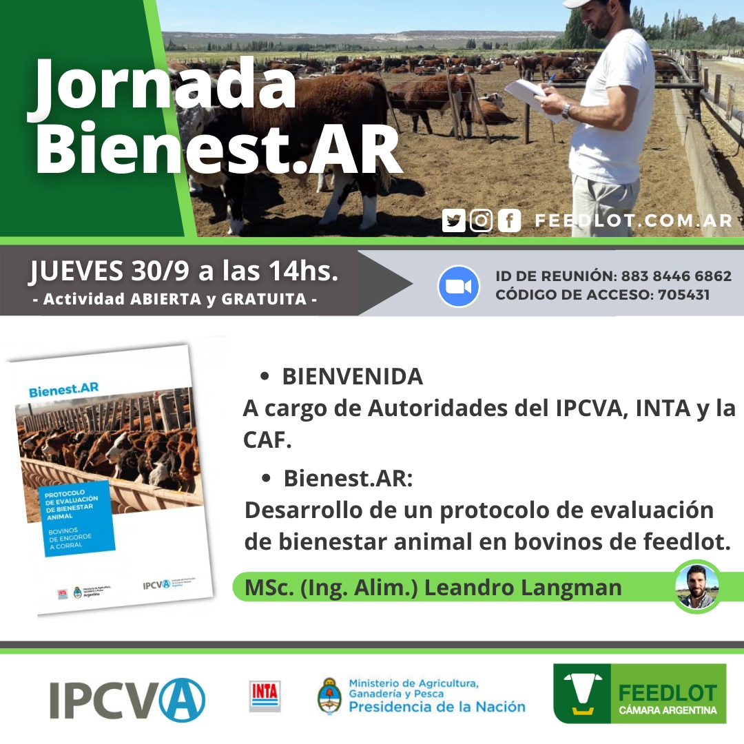 Se llevará a cabo el jueves 30 de septiembre a las 14 horas. Se presentará el manual "Bienest.AR, Protocolo de evaluación de bienestar animal en bovinos de engorde a corral". Palabras clave: Feedlot. Jornada. Bienestar animal