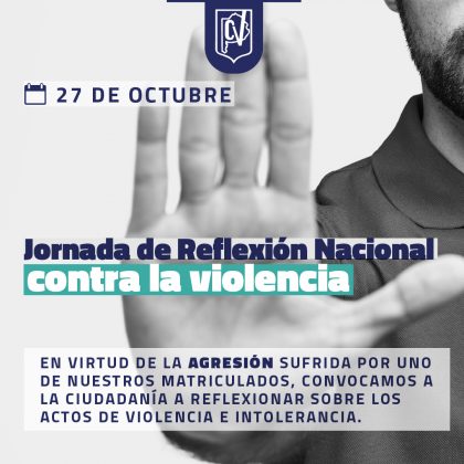 En virtud de los hechos de público conocimiento, en donde un profesional matriculado de nuestro colegio fue violentamente agredido, el Colegio de Veterinarios de la Provincia de Buenos Aires (CVPBA) convoca a una Jornada de Reflexión Nacional contra las distintas formas de violencia y agresión para el próximo miércoles 27 de octubre.