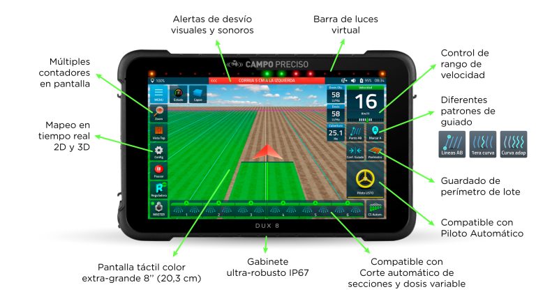 El banderillero y mapeador satelital DUX 8 permite monitorear el trabajo realizado en el campo de manera remota, ahorrar tiempo e insumos, maximizar la productividad y minimizar el impacto ambiental. Fácil de usar e instalar en cualquier tipo de maquinaria, ya sean maquinistas de mucha o poca experiencia. De industria Argentina y a un precio muy accesible.