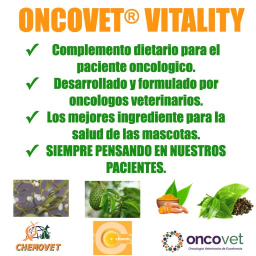 ONCOVET VITALITY es el mejor complemento natural para tu paciente oncológico. Destinado a perros y gatos.