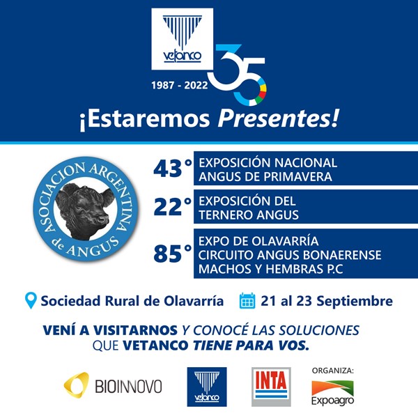 Del 21 al 23 de septiembre próximos, Vetanco,laboratorio veterinario internacional que desde hace 35 años desarrolla, elabora y comercializa productos innovadores para la salud y la producción animal, estará presente en la 43° Exposición Nacional Angus de Primavera, 22° Exposición del Ternero Angus y 85° Expo de Olavarría Circuito Angus Bonaerense Machos y Hembras P.C. Allí tendrá un stand institucional en el que promocionará la primera vacuna a subunidad direccionada del mundo, elabora por Bioinnovo, Vedevax BLOCK. También estará presente el equipo del servicio técnico del laboratorio para asesorar a los productores.