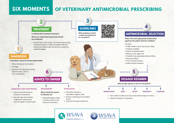 Si bien varias infografías ya abordan este problema, el TGG consideró que era necesario centrarse específicamente en el proceso de toma de decisiones en el momento de la prescripción. Para llenar este "vacío", ha trabajado con la profesora Jacqueline Norris y la profesora asociada Jane Heller del AMR Vet Collective en el desarrollo del concepto de los seis momentos de la prescripción veterinaria de antimicrobianos. Cada 'Momento' se ilustra en la infografía, junto con los diversos elementos y factores asociados que los veterinarios deben considerar en cada decisión de prescripción.