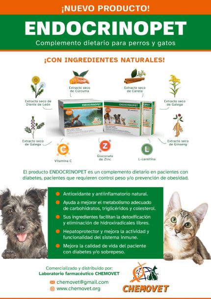 Endocrinopet es un complemento dietético pensado para pacientes con diabetes y para aquellos que requieren control de peso y/o prevención de la obesidad. Presenta propiedades antioxidantes, es hepatoprotector y mejora la actividad y funcionalidad del sistema inmune.
