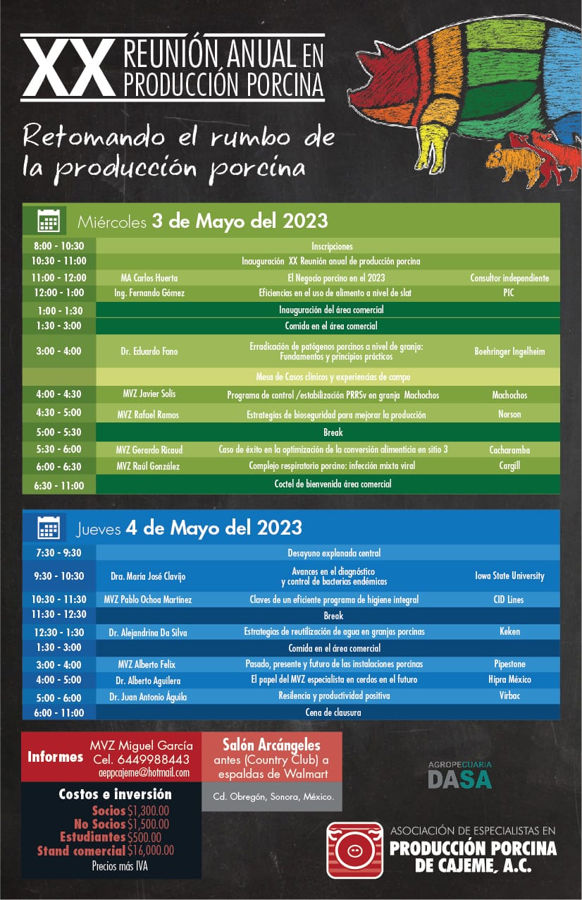 La Asociación de Especialistas en Producción Porcina de Cajeme, AC, te invita a la XX Reunión Anual en Producción Porcina a realizarse el 3-4 de mayo en Cd. Obregón Sonora, México.