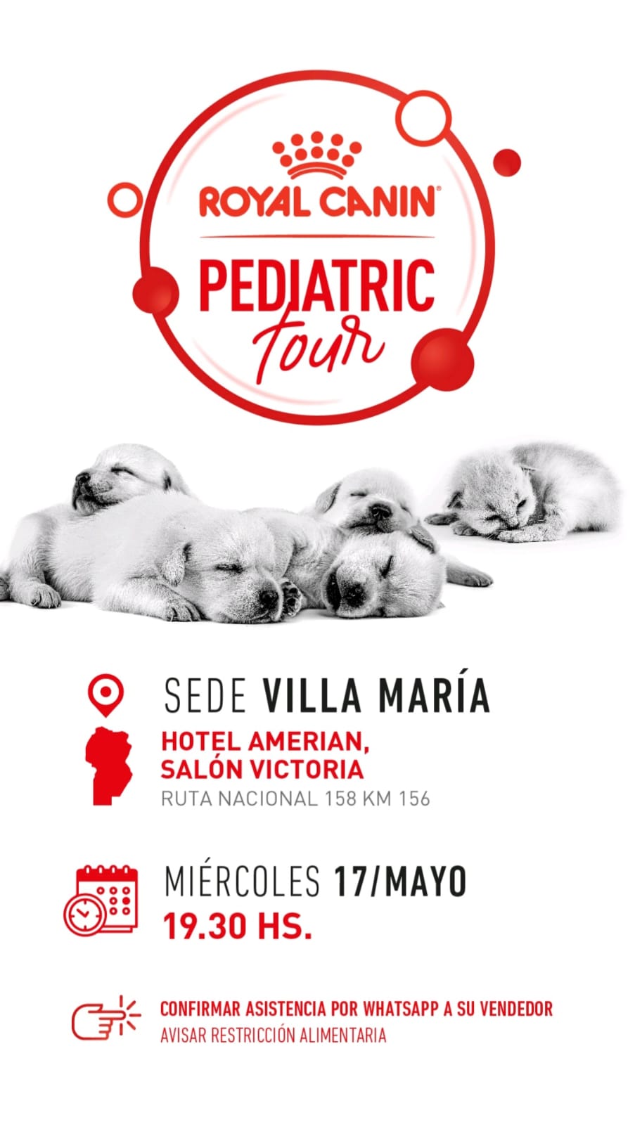 Royal Canin presenta “Pediatric Tour”, un recorrido por cinco ciudades del país para dar a conocer la importancia del desarrollo pediátrico de los cachorros y gatitos, sus primeros cuidados para una vida saludable y el fortalecimiento del vínculo tutor-mascota en sus primero años de vida de la mano de colegas expertos de la marca. Este año, el tour visitará Villa Maria- Córdoba, Junín- Buenos Aires, Comodoro Rivadavia- Chubut, Paraná- Entre Ríos y Pilar- Buenos Aires.