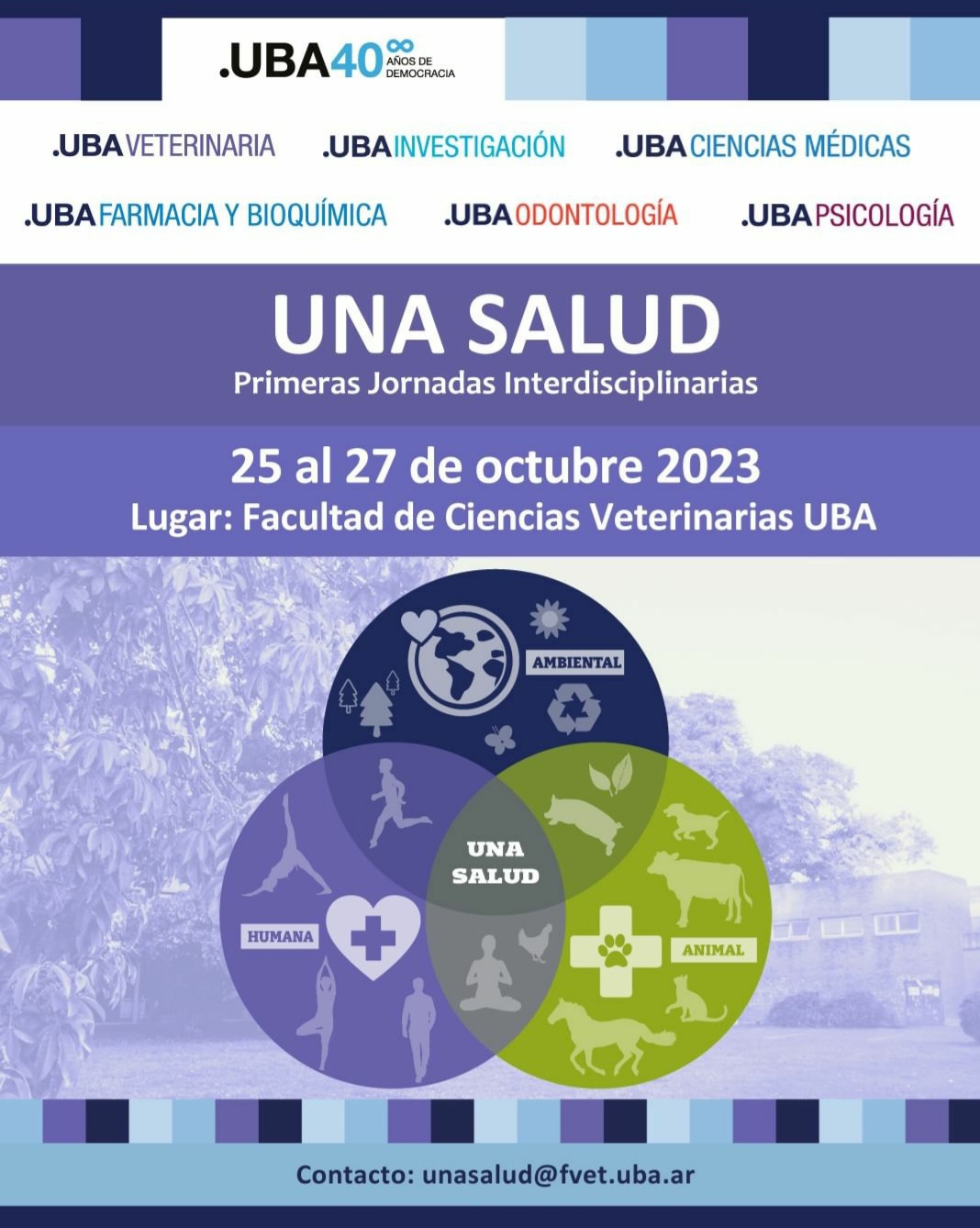 Las Facultades de Ciencias Veterinarias, Farmacia y Bioquímica, Medicina, Odontología y Psicología de la Universidad de Buenos Aires organizan las Primeras Jornadas Interdisciplinarias “UNA SALUD”, donde destacados profesionales del ámbito nacional e internacional dictarán conferencias, se realizarán mesas redondas y se presentarán trabajos científicos.