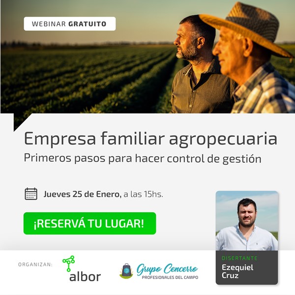 El próximo jueves 25 de enero, a las 15 hs AR, se realizará un webinar gratuito sobre control de gestión en una empresa familiar agropecuaria. En el mismo, se compartirán los lineamientos iniciales de una metodología de control de gestión diseñada para convertir a los productores agropecuarios en los gerentes de sus propios negocios. Además, se mostrará cómo implementar prácticas de control económico-financiero utilizando herramientas como presupuestos, flujos de caja, análisis patrimoniales e informes de gestión, que el sistema de gestión Albor Campo resuelve de forma ágil.