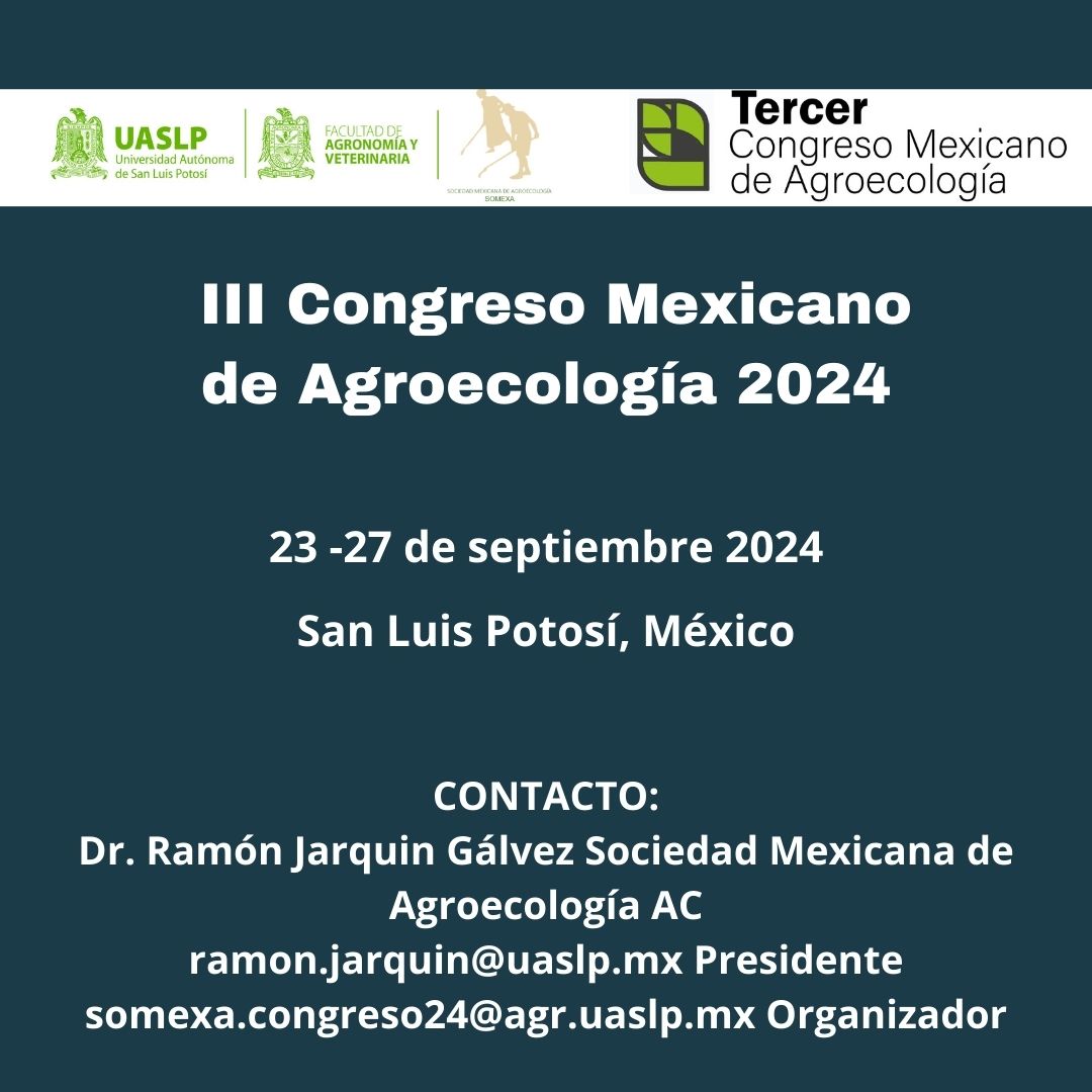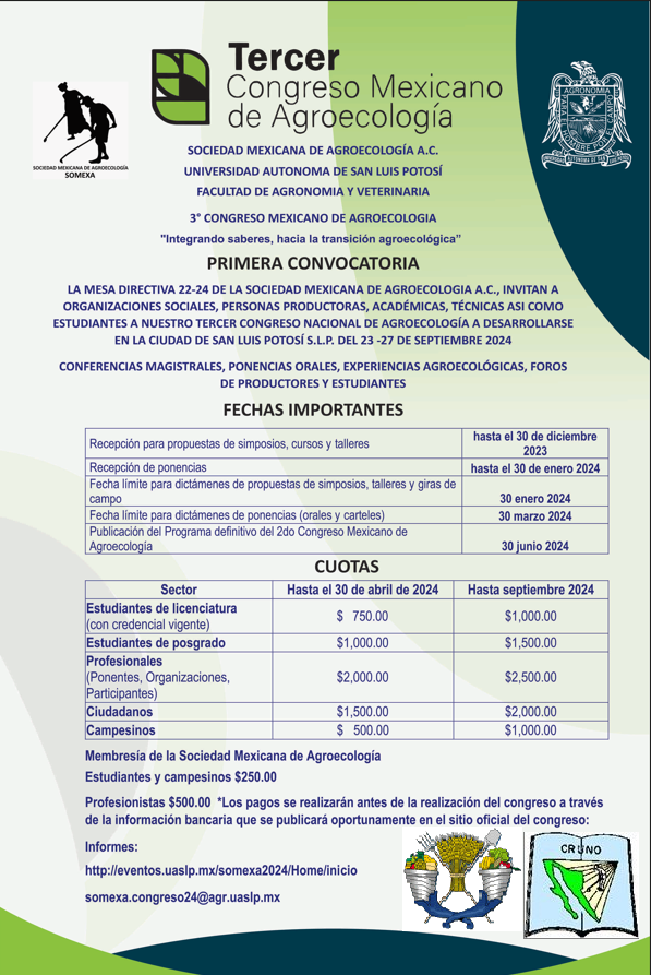 Del 23 -27 de septiembre 2024, en la ciudad de San Luis Potosí, México, se realizará el tercer Congreso con el lema “Integrando saberes para la transición agroecológica”, donde se compartirán los avances logrados en la implementación del paradigma agroecológico. Se reconocerá la importancia del intercambio de saberes de mujeres y hombres, sus semejanzas y diferencias, a lo largo del sistema alimentario.