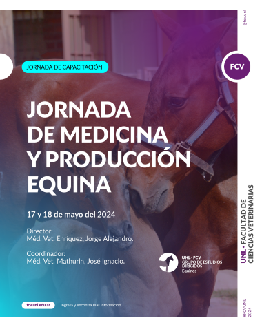 Organizada por la Cátedra Clínica de Equinos y Grupo de Estudios Dirigidos Equinos (FCV-UNL), esta jornada se realizará durante los días 17 y 18 de mayo en la Facultad de Ciencias Veterinarias de Esperanza. TAGS: Jornada equinos. Equinos. Producción equina. Medicina equina. Medicina veterinaria. Veterinaria